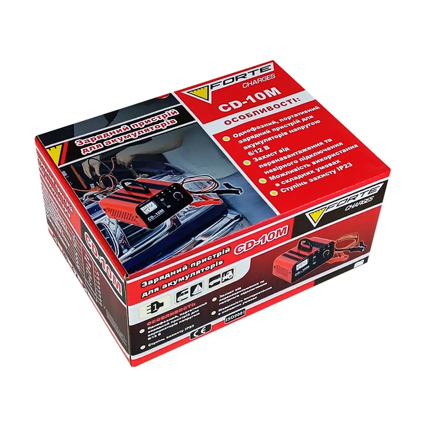 Зарядное устройство для аккумулятора Forte CD-10M необходимая вещь любого автолюбителя предназначено для зарядки батарей свинцово-кислотного типа. Обладает небольшим весом и компактными габаритами, что позволяет легко хранить в гараже или легковом автомобиле.