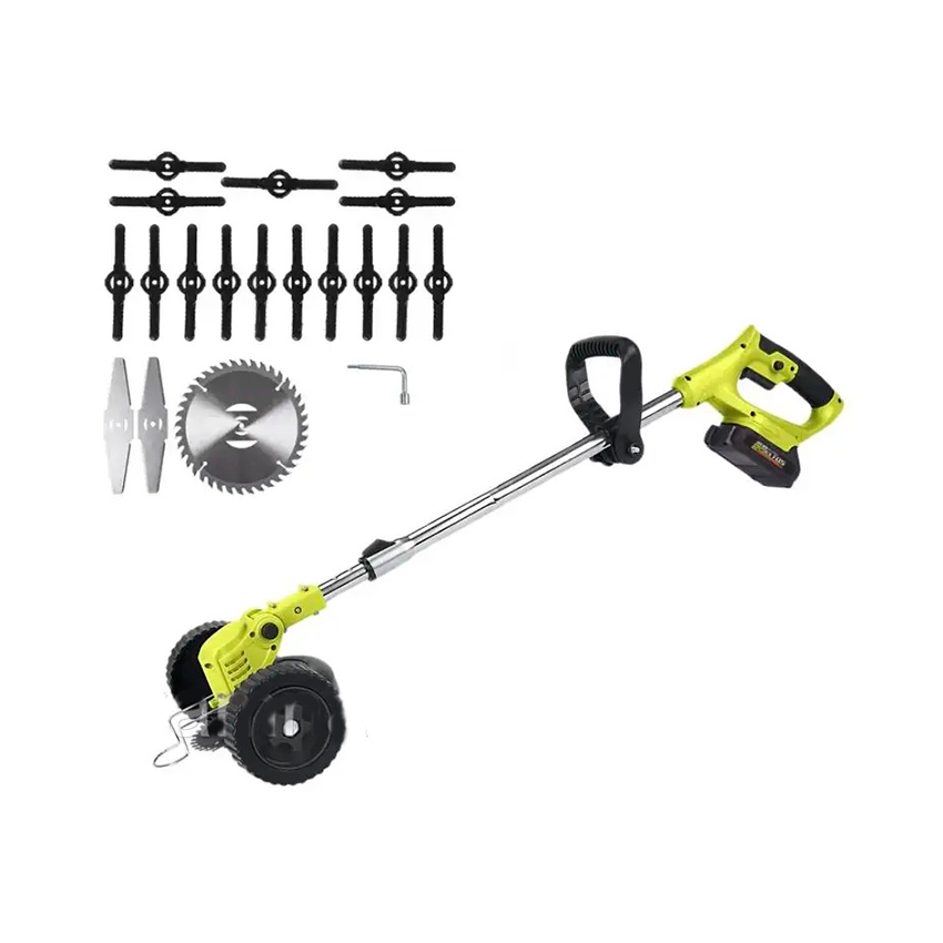 Аккумуляторная коса имеет двигатель который способен набирать до 8000 об/мин позволяя эффективно выполнять поставленное задание. В комплекте поставляется 18 насадок под разные виды работ, ширина обкашиваемой области составляет 150 мм, так же предусмотрена поворотная косильная головка