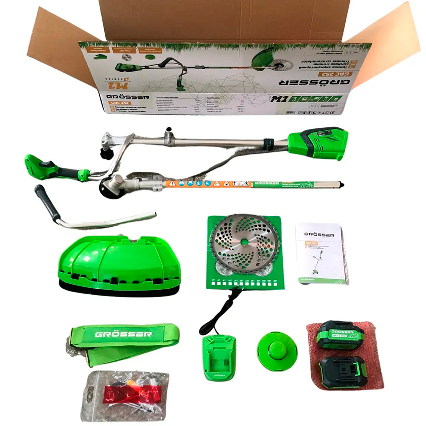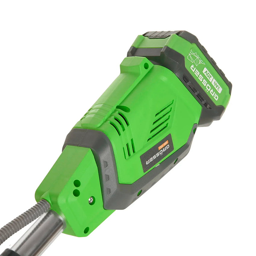 Аккумуляторный триммер Grosser GBC 252 имеет верхнее расположение двигателя и создан на основе безщёточного двигателя, обладает полной автономностью так как работает от аккумуляторной батареи ёмкостью 4000 мАч и напряжением 20 В. В комплекте поставляется 2 сменных АКБ и зарядное устройство.