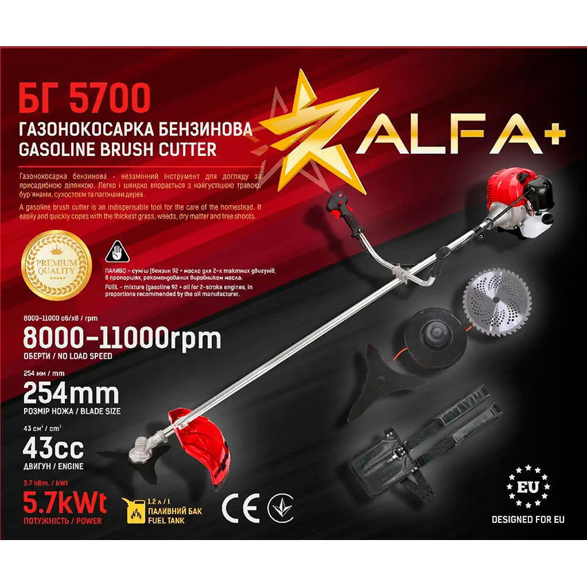 Данная модель бензиновой косы Alfa БГ-5700 обладает мощностью 5700 Вт (7,8 л.с.), рабочий объём двигателя составляет 43 куб.см., стенки цилиндра поршня имеет хромовое покрытие. Улучшенная крыльчатка способствует более эффективному охлаждению, а фирменный карбюратор обеспечивает устойчивую работу двигателя.