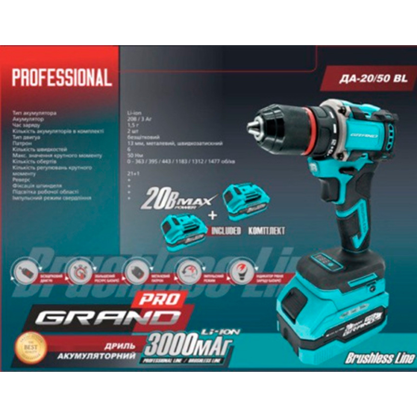 Купить аккумуляторный шуруповерт Grand ДА-20/2 BL PRO по доступной цене в интернет-магазине ТехноЛидер.