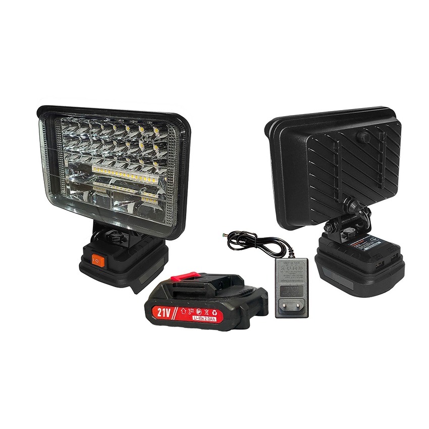 Прожектор имеет светодиодные элементы которые обеспечивают высокую яркость при низком потребление энергии. Работает от аккумуляторной батареи, которое имеет посадочное место макитовского типа,то есть Вы можете использовать АКБ от шуруповерта, болгарки, цепной пилы с идентичными клемами.